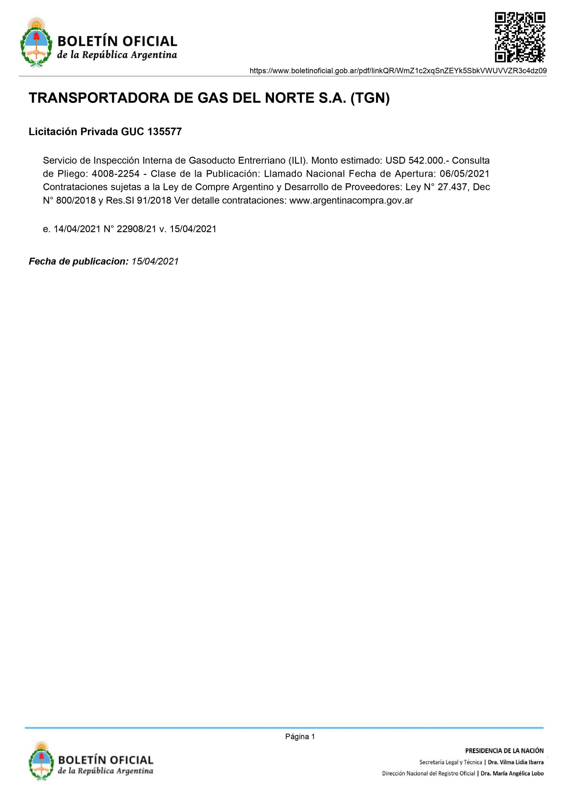 Desde el día 12 de abril pasado, a través del portal de compras de Transportadora de Gas del Norte S.A. (TGN) se efectivizó el llamado a Concurso para la ejecución de los trabajos de Inspección Interna “pipping” en el Gasoducto Entrerriano propiedad de la Compañía Entrerriana de Gas (CEGSA).